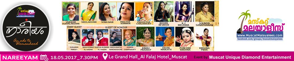 നിങ്ങളേവരും ആകാംക്ഷയോടെ കാത്തിരുന്ന നമ്മുടെ നാരീയം ഈ വരുന്ന വ്യഴായ്ച (18-05-2017) രാത്രി കൃത്യം 7.30 ന് റൂവി അല് ഫലാജ് ഗ്രാന്ഡ് ഹാളില് വെച്ച് നടക്കുന്നതാണ്..