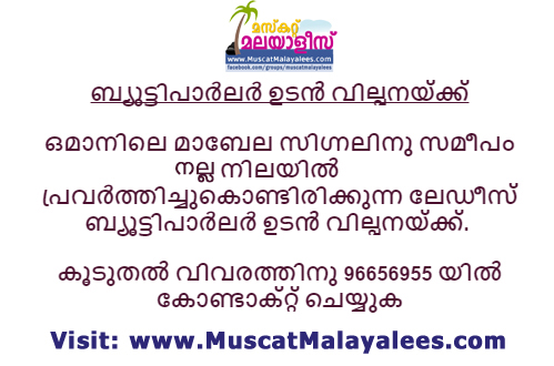 ഒമാനിലെ മാബേല സിഗ്നലിനു സമീപംനല്ല നിലയില്‍ പ്രവര്‍ത്തിച്ചുകൊണ്ടിരിക്കുന്ന ലേഡീസ് ബ്യൂട്ടിപാര്‍ലര്‍ ഉടന്‍ വില്പനയ്ക്ക്.