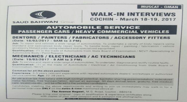Walk in Interviews (March 18,19) at Cochin for Saud Bahwan, Muscat Oman
