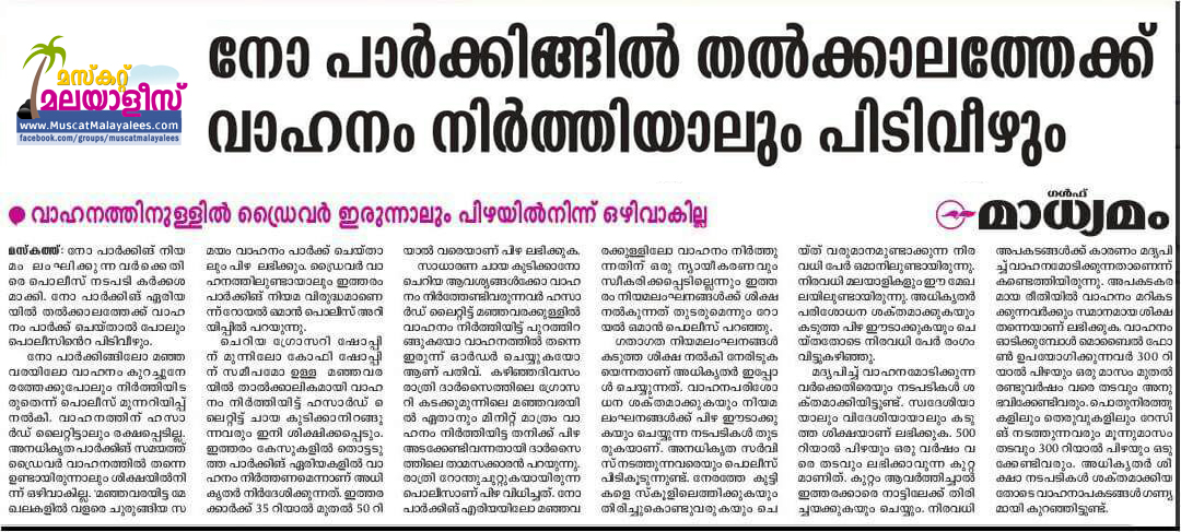 നോ പാര്ക്കിങ്ങിലോ മഞ്ഞവരയിലോ വാഹനം കുറച്ചുനേരത്തേക്കുപോലും നിര്ത്തിയിടരുതെന്ന് പൊലീസ് മുന്നറിയിപ്പ് നല്കി. വാഹനത്തിന് ഹസാര്ഡ് ലൈറ്റിട്ടാലും രക്ഷപ്പെടില്ല. അനധികൃത പാര്ക്കിങ് സമയത്ത് ഡ്രൈവര് വാഹനത്തില് തന്നെ ഉണ്ടായിരുന്നാലും ശിക്ഷയില്നിന്ന് ഒഴിവാകില്ല. ‘മഞ്ഞവരയിട്ട മേഖലകളില് വളരെ ചുരുങ്ങിയ സമയം വാഹനം പാര്ക്ക് ചെയ്താലും പിഴ ലഭിക്കും. ഡ്രൈവര് വാഹനത്തിലുണ്ടായാലും ഇത്തരം പാര്ക്കിങ് നിയമ വിരുദ്ധമാണെന്ന് റോയല് ഒമാന് പൊലീസ് അറിയിപ്പില് പറയുന്നു.